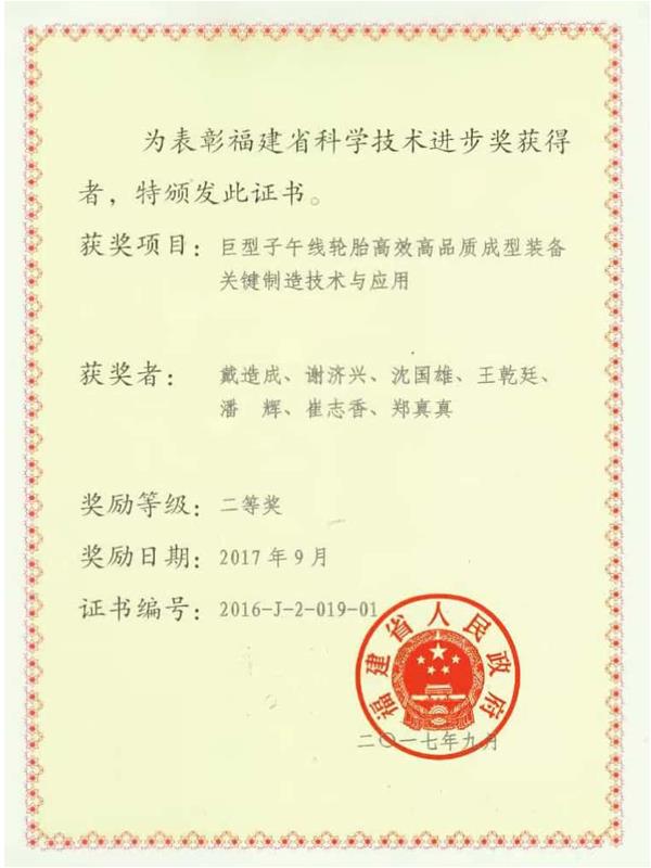 福建省2016年度科學(xué)技術(shù)進(jìn)步獎(jiǎng)二等獎(jiǎng)-巨型子午線(xiàn)輪胎高效高品質(zhì)成型裝備關(guān)鍵制造